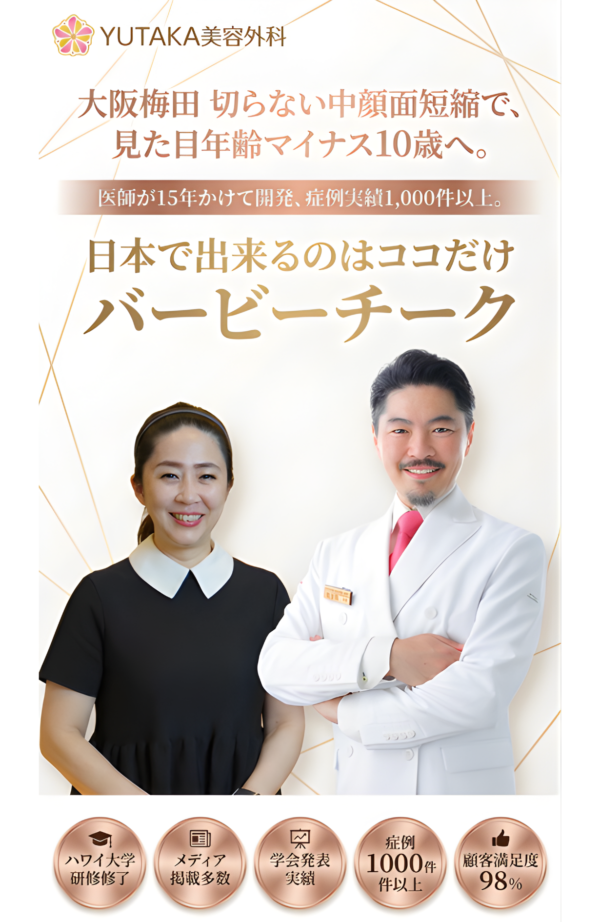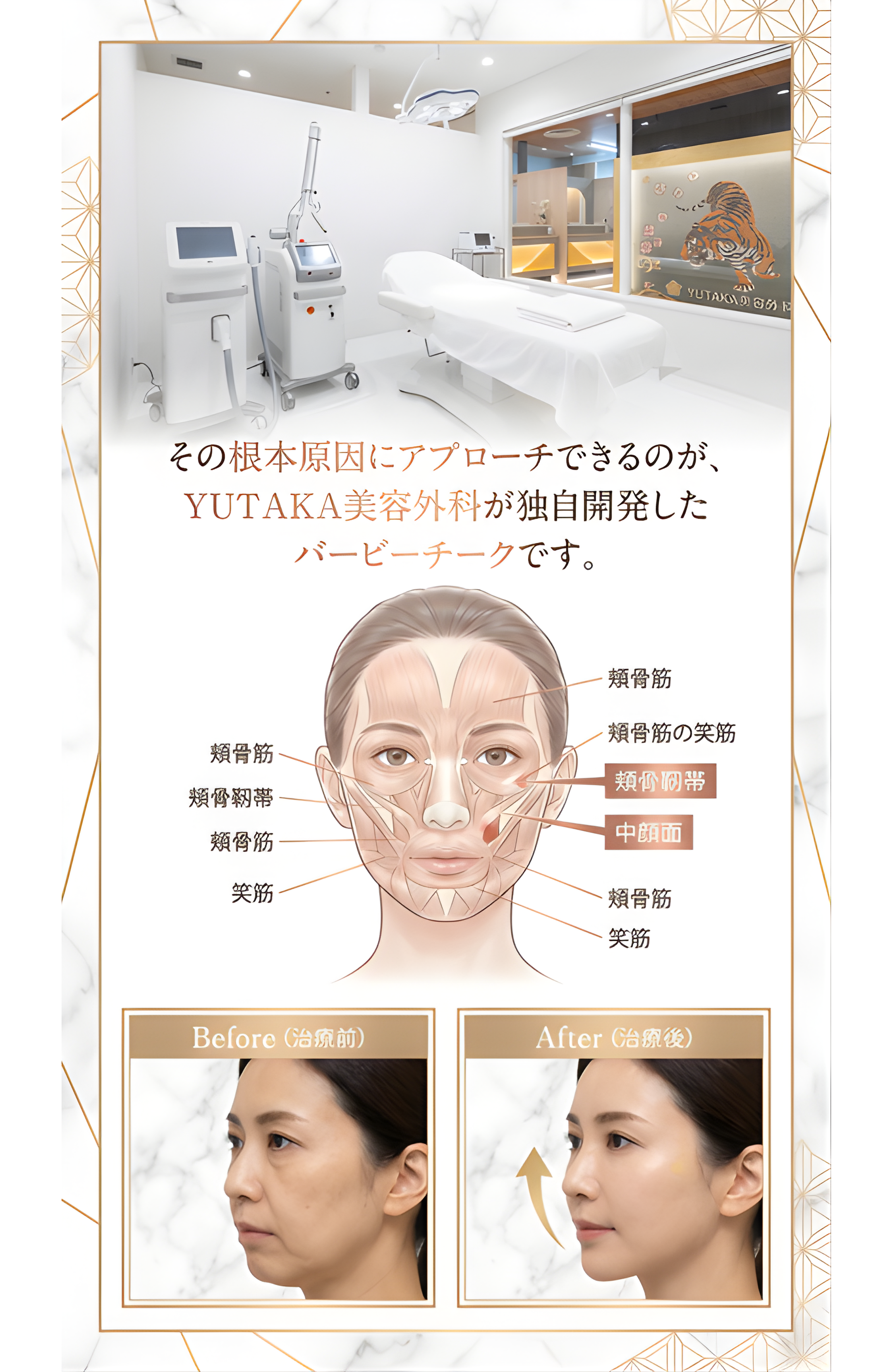 中顔面短縮とは、目の下から口元までの「中顔面」と呼ばれる部分を短く見せる美容施術です。YUTAKA美容外科では、メスや糸を使わず、ヒアルロン酸注入による「バービーチーク」で中顔面短縮を実現します。靱帯を利用した独自の注入技術により、自然で効果的なリフトアップが可能です。