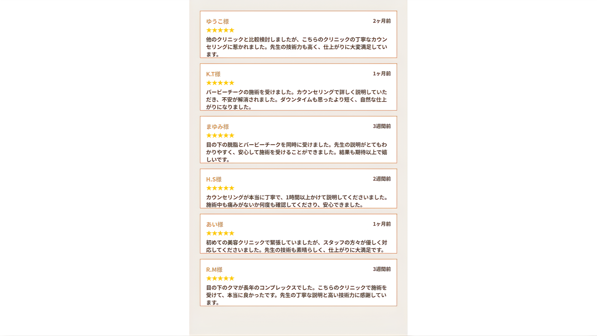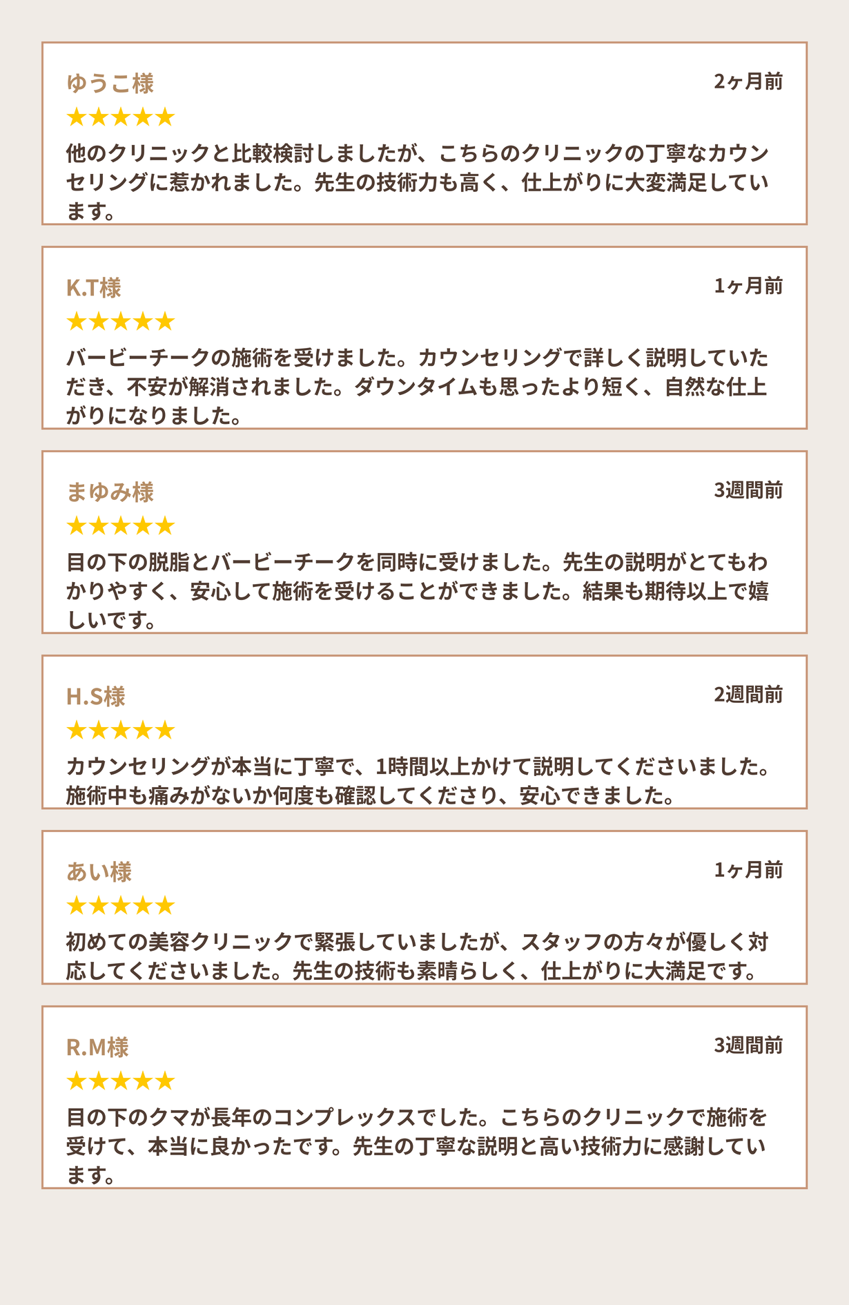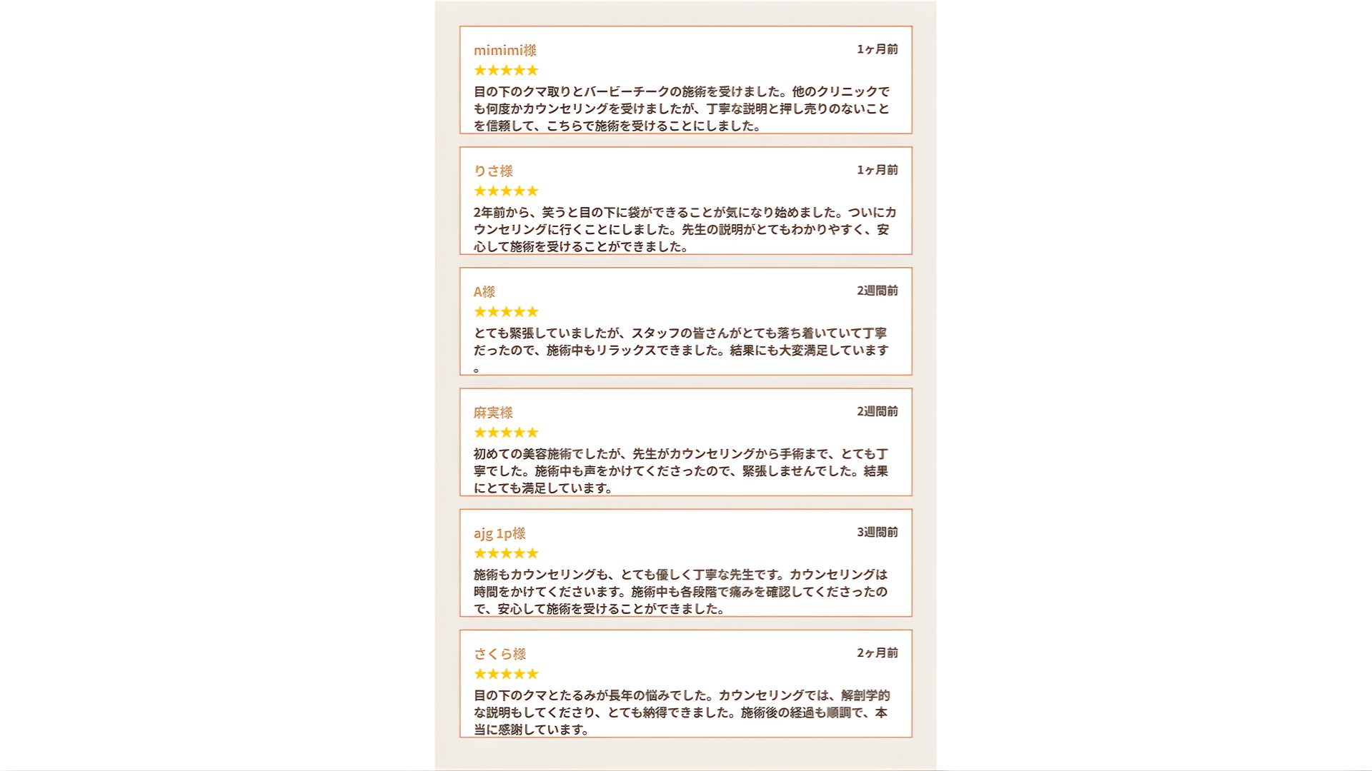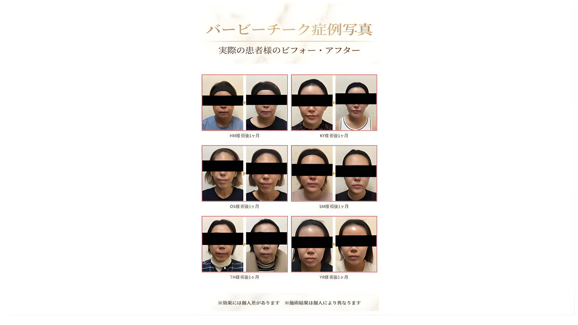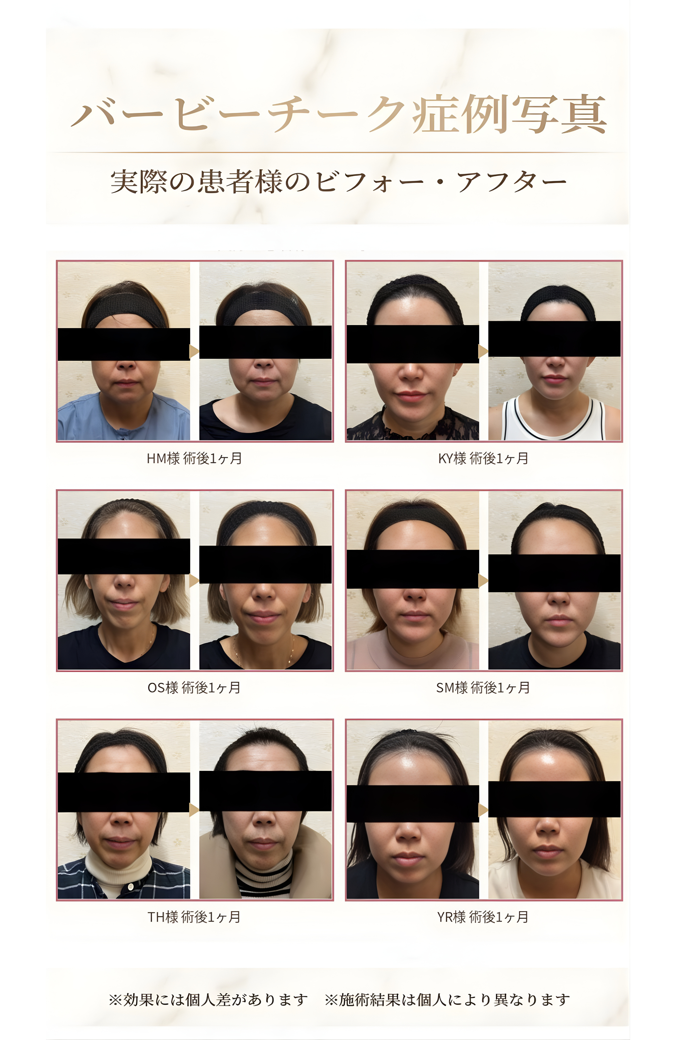 バービーチーク単体の施術時間は約20分です。経結膜的脱脂術(目の下のクマ取り)と組み合わせる場合は、約1.5時間程度となります。施術当日にお帰りいただけます。