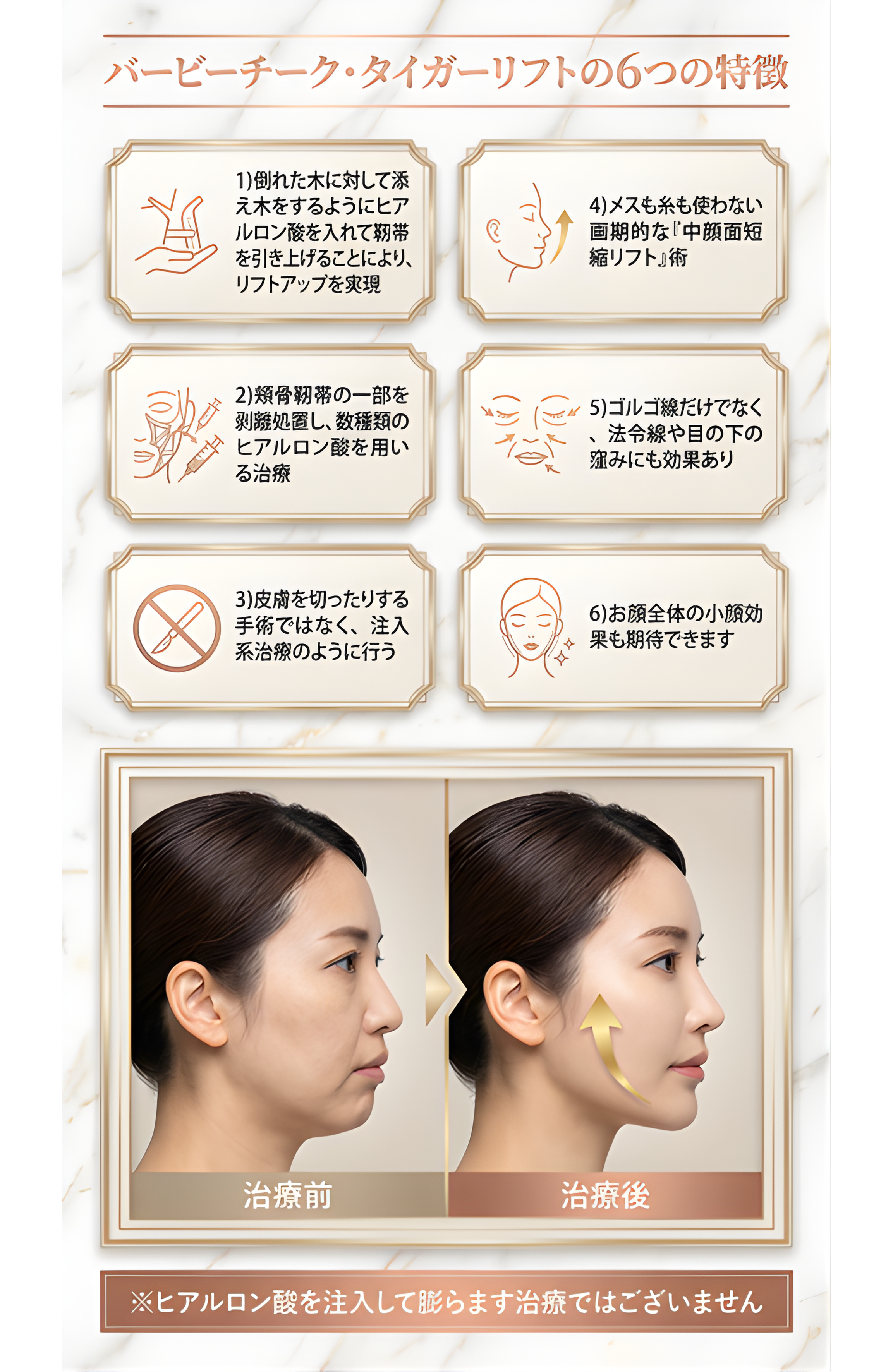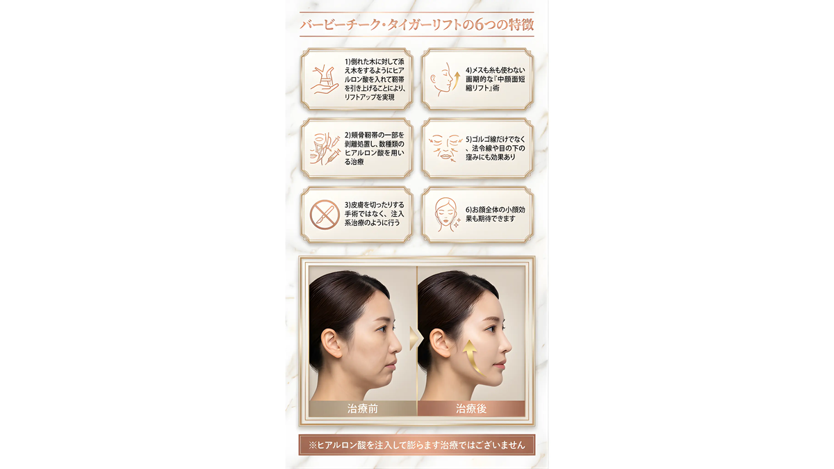 ご安心ください。バービーチークは、ヒアルロン酸を「固定ピン」のように使用する治療です。1箇所に注入する量は非常に少量です。ボリュームで膨らませるのではなく、靱帯を利用して構造を引き上げるため、不自然に膨らむことはありません。